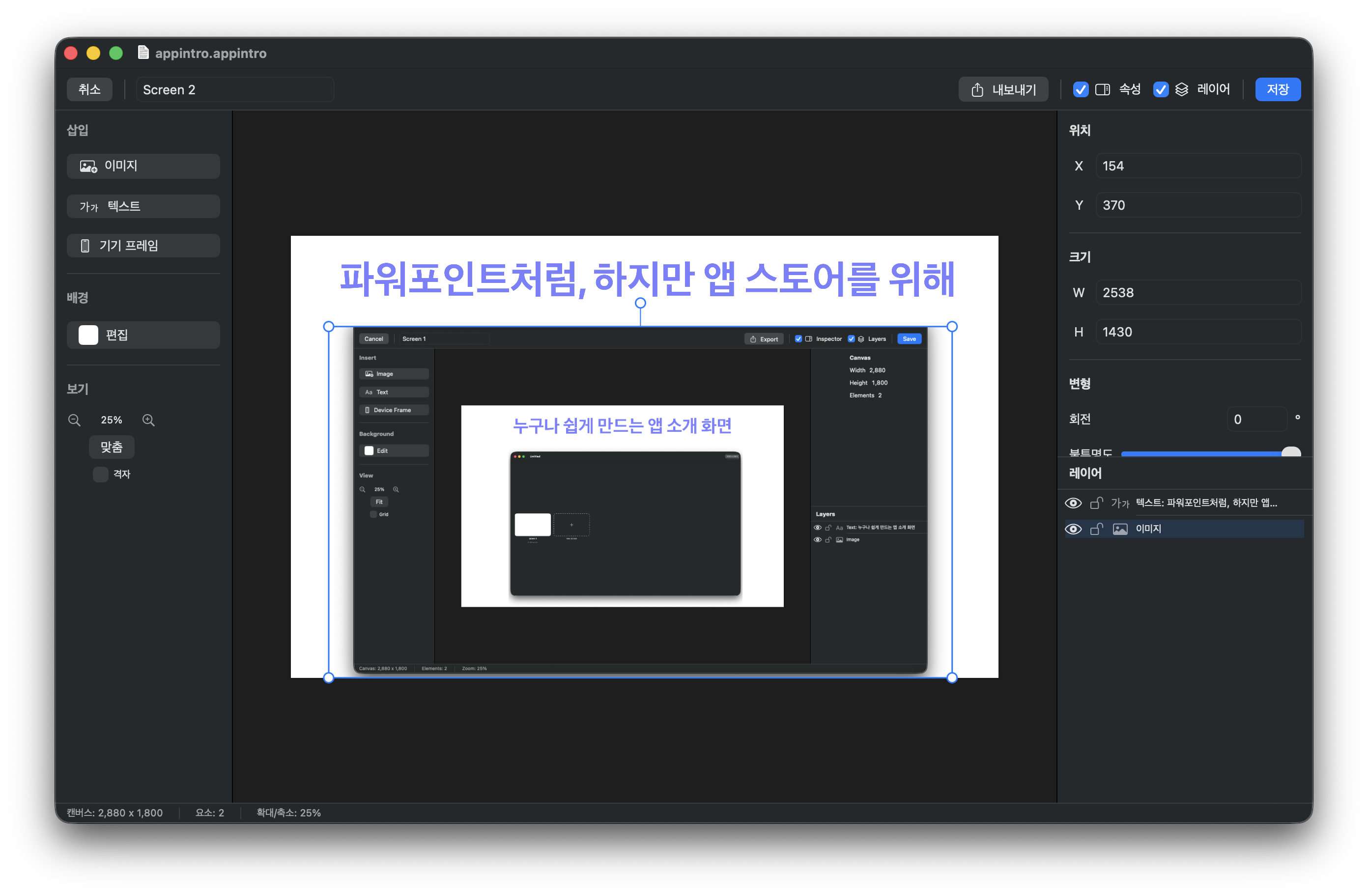 이미지와 텍스트를 캔버스 위에 자유롭게 배치하고, 완성된 화면을 이미지로 내보내기하세요. 앱 스토어용 소개 화면을 누구나 손쉽게 만들 수 있습니다.